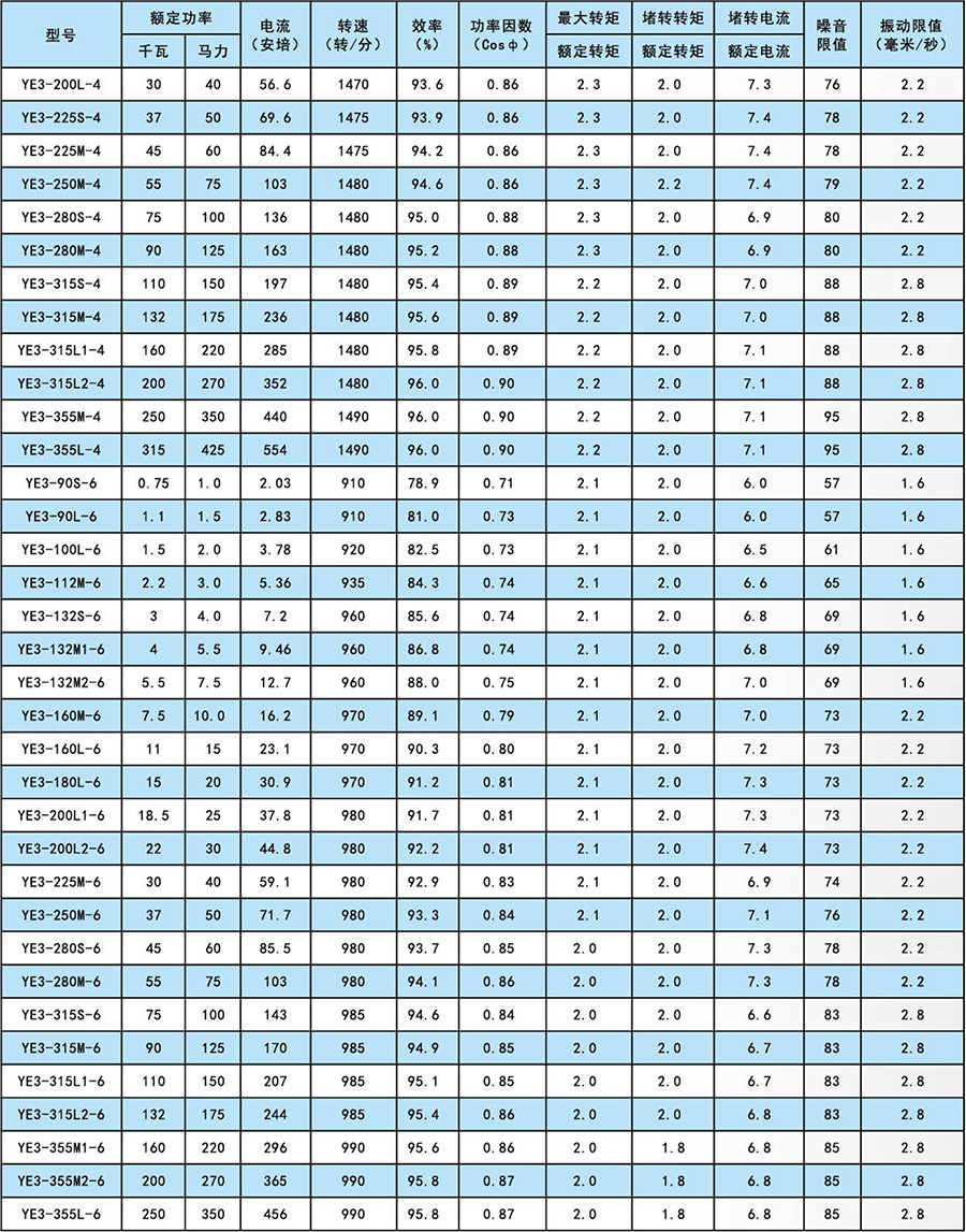 YE3 series high efficiency three phase asynchronous motors implement GB/T 28575 YE3 Series  Three Phase Asynchronous Motors Technical Specifications (frame size 80-355). The efficiency meets or exceeds  GB 18613 Medium and Small Three Phase Asynchronous Motors Efficiency Minimum Limit Values and Efficiency Level, consistent with IE3 efficiency level in international standard IEC60034-30. This series have features as high efficiency, save energy, low running cost, low noise and vibration, liable running. The products are applied to various machines that have no special requirements .