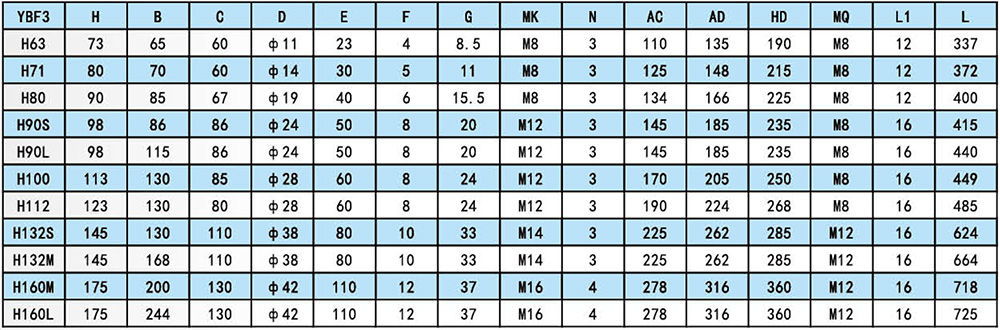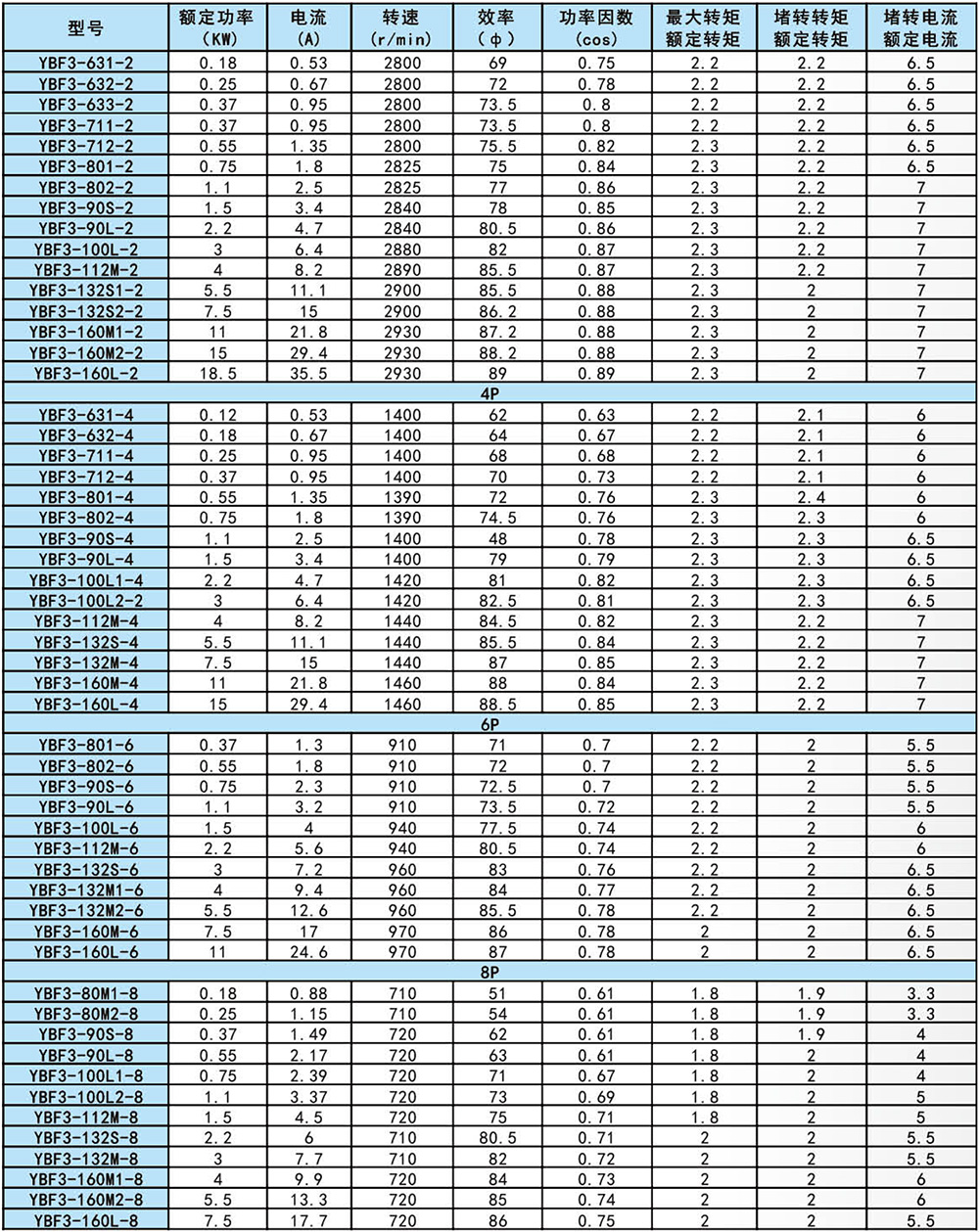 YBF3 explosion-proof motor is a new product designed and developed for ventilation fan. It has the characteristics of small size, light weight, high efficiency, low noise, low vibration, safe and reliable operation, easy operation and maintenance. YBF3 explosion-proof motor power level and installation dimensions conform to National Standards and the International Electrotechnical Commission IEC standards, reach the domestic first-class technical level. YBF3 flameproof three-phase asynchronous motor for fans implement the standard GB3836.2 Explosive Atmosphere Electrical Apparatus, Part 2, Apparatus with Flameproof Type “d” Enclosure , MT451-1995 Flameproof Low-voltage Three-phase Asynchronous Motor for Coal Mine General Technical Specification for Safety Performance". The main performance is in line with the provisions of "Flameproof three-phase asynchronous motor Technical conditions Part 5 YBF3 series fan flameproof three-phase asynchronous motor (frame No. 63-355)", the explosion-proof mark is Exdb LBT4, EXLBT4(original mark Exd). it mainly used as the prime motor of the fan. It is suitable for the place where the non-mining surface of coal mine has methane flammable gas or the explosive gas environment formed between coal mine and air.
